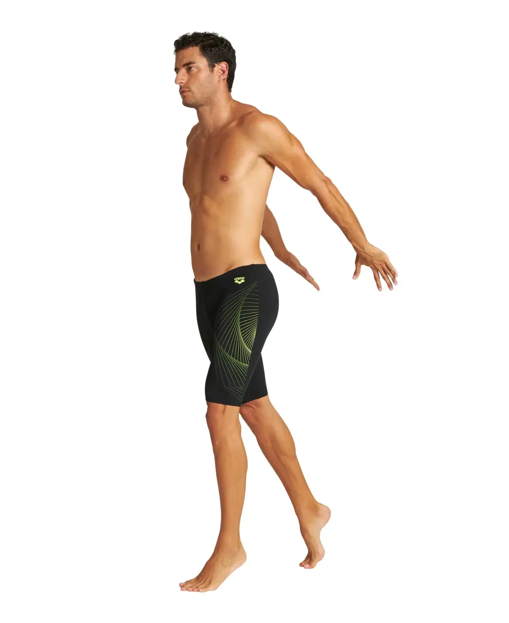 ARENA Men's Spiral Vision Jammer Black is a polished athletic swimsuit. Emblazoned with a hypnotic spiral graphic on the sides, this sleek men's swimsuit is made for performance and longevity. Just right for seasons of training and serious swimming.